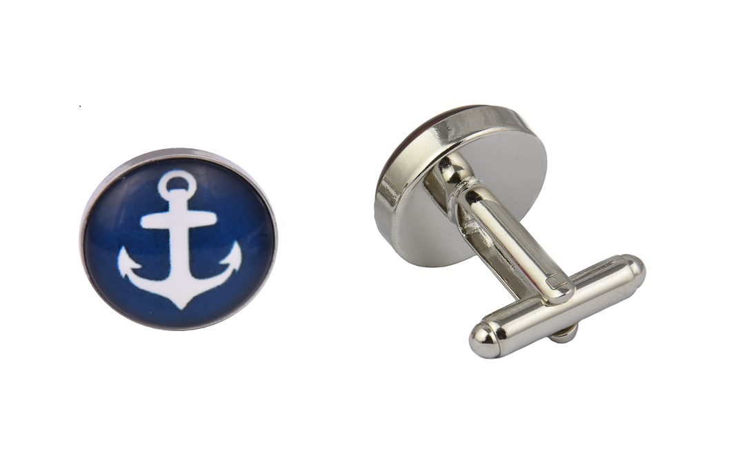 AAA Quality Cabochon Glass Cufflinks with each cufflink having a different design. Both white designs against a striking blue background, one cufflink features an anchor design whilst the other features a boat steering wheel design. Presented in a Luxury Black Velvet Cufflinks Bag (Upgrade for a Cufflinks Box).